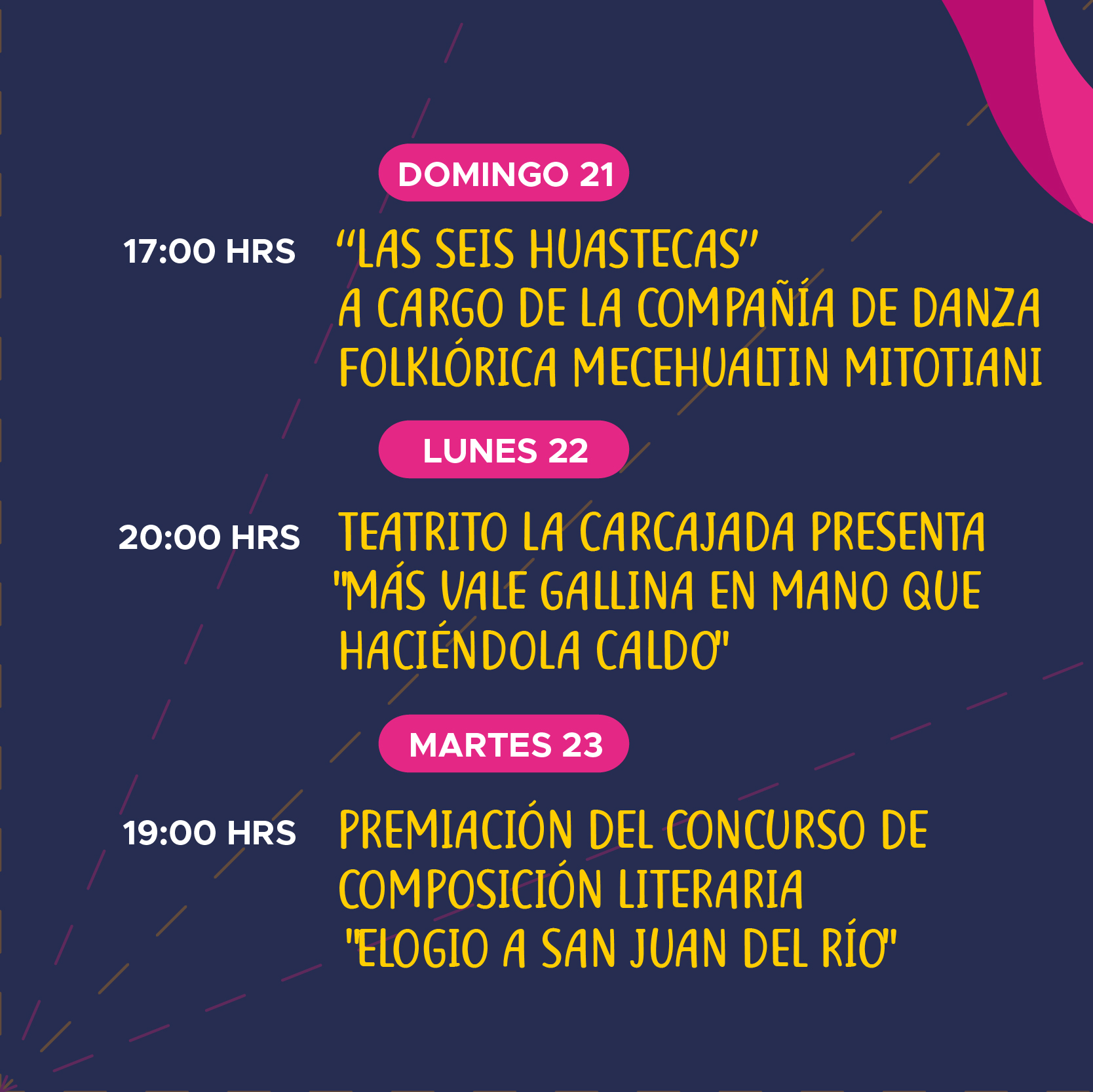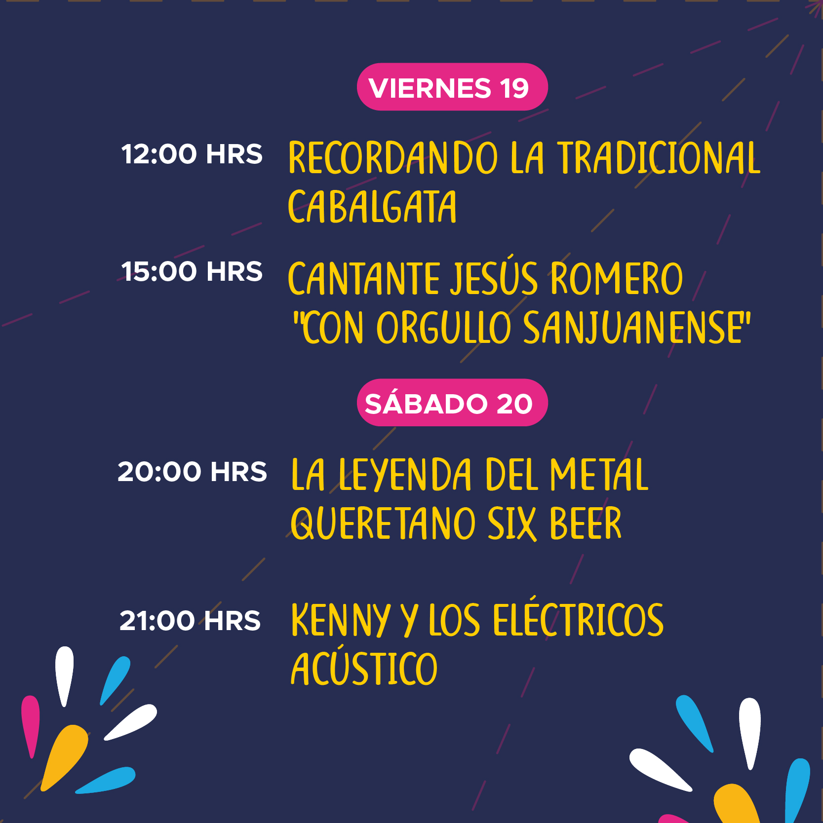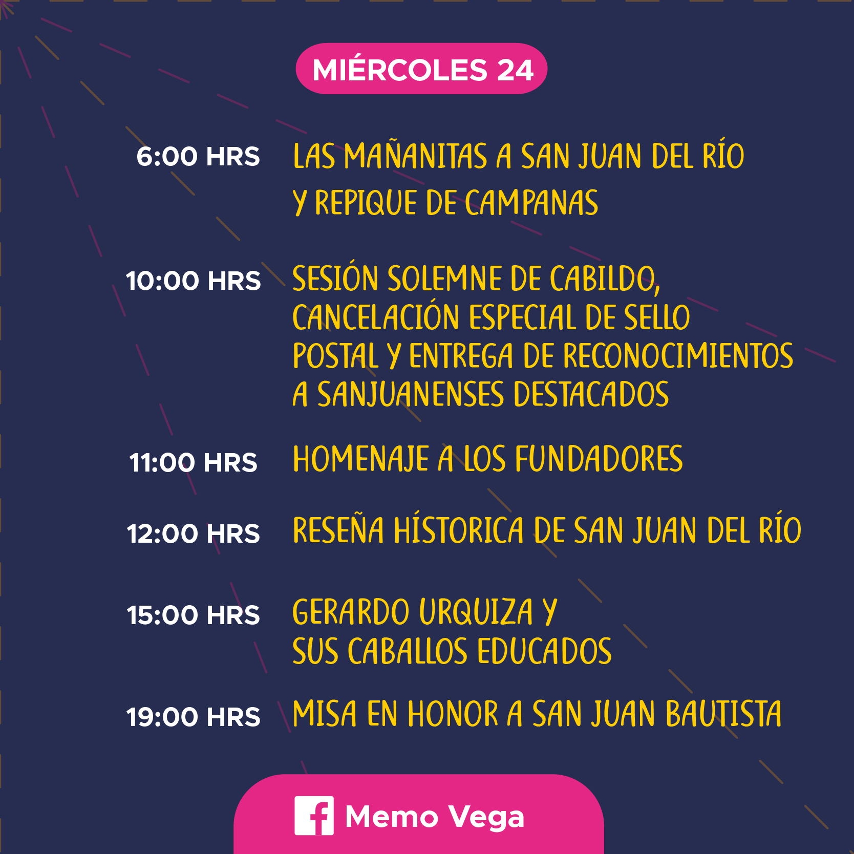 Para el miércoles 24 de junio, Día de San Juan, el programa iniciará desde las 6 de la mañana, con las mañanitas con mariachi y repique de campanas en las iglesias de nuestra ciudad, en honor a San Juan Bautista.